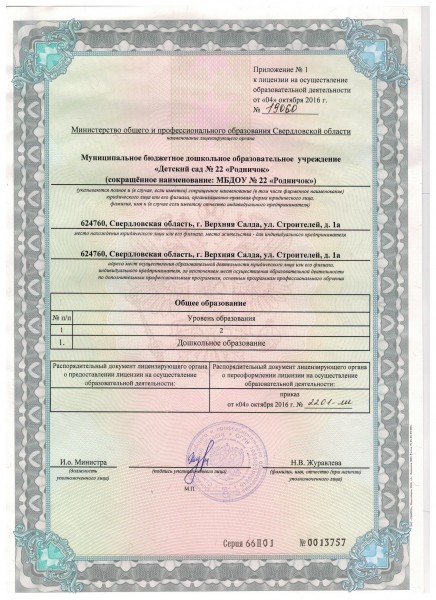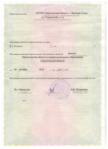 Адрес места осуществления образовательной деятельности— 624760 Российская Федерация, Свердловская область, г.Верхняя Салда, ул. Строителей, д. 1А.